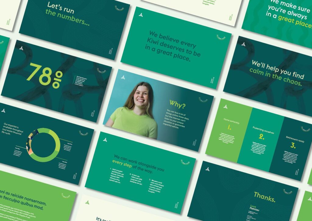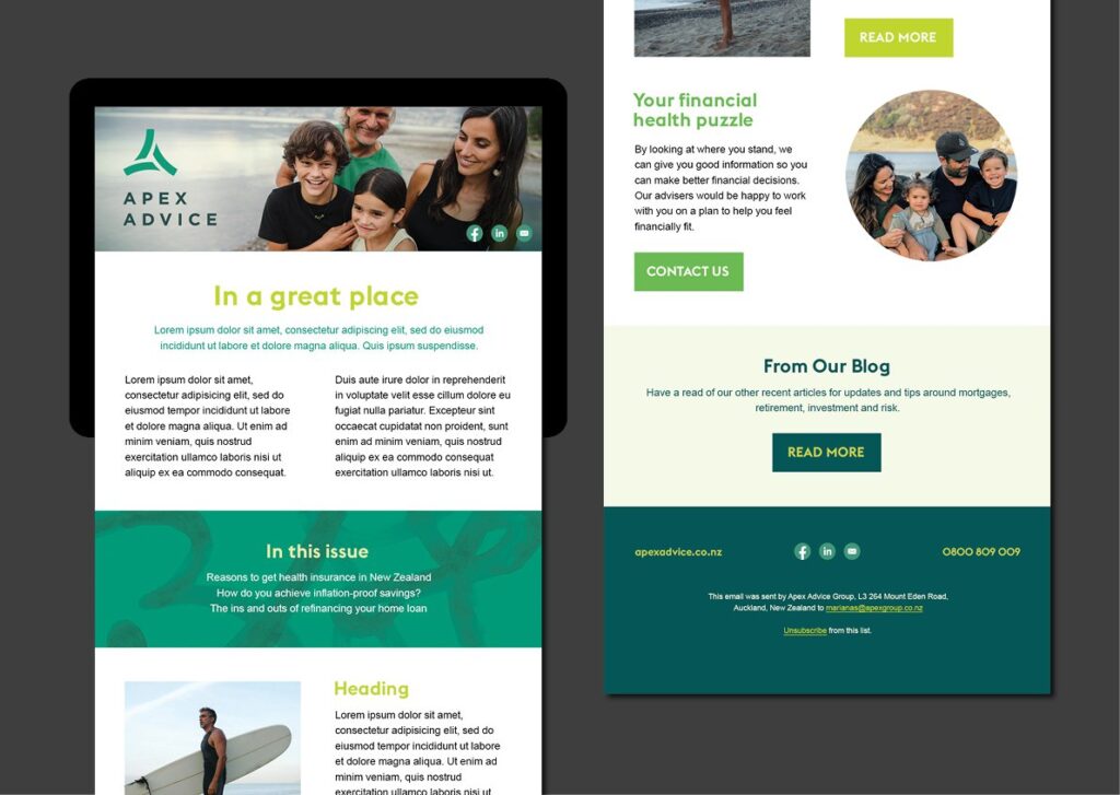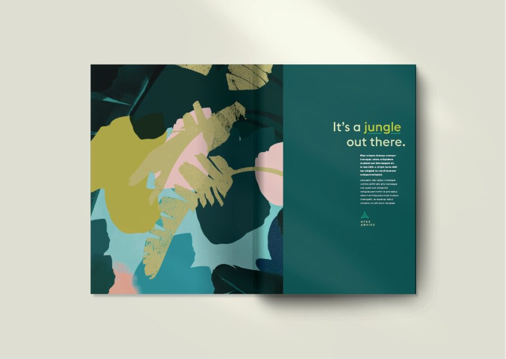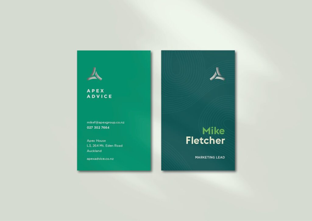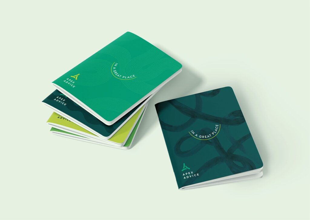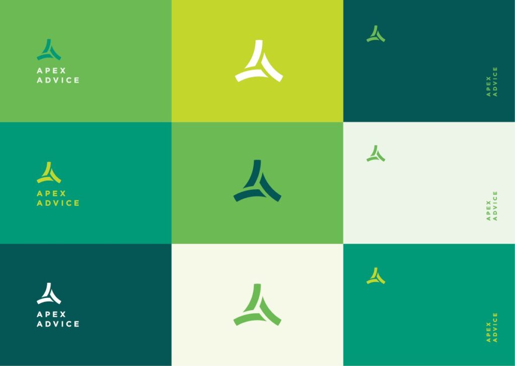 When it came to the visual aspects of the brand, we started with refining the existing logo slightly. This component was to remain largely untouched, but through a few small tweaks, we created a format of the icon that increased legibility and made more hierarchical sense. Green is a natural colour choice in representing growth and success, so we introduced an entire family of green hues – some have calm and trustworthy traits, while others add energy and momentum. Combined with a typeface full of personality, the new Apex Advice brand was evolving into a fresh new realm.